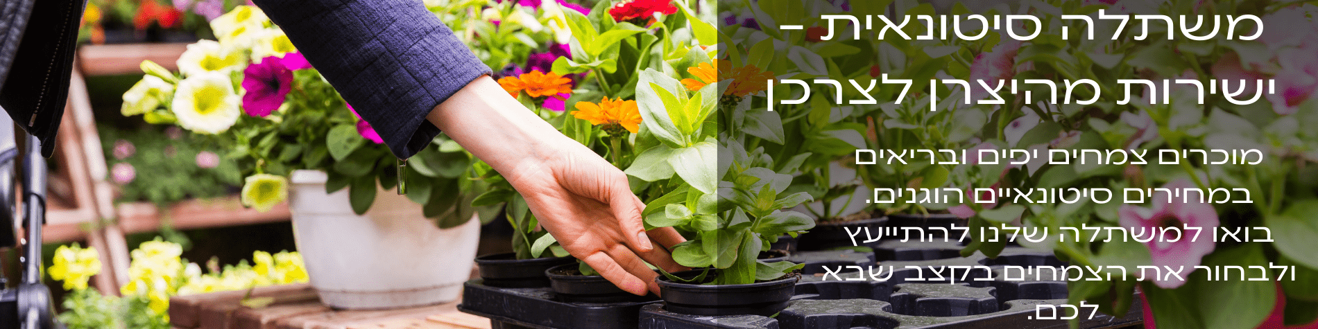 אנו מתמחים בגידול ושיווק של צמחי בית, צמחים לגינה, תבלינים, סחלבים, פרחים עונתיים ועוד. תוכלו למצוא באתר אדניות עץ, כלי גינון, כדים, תערובות אדמה לשתילה, דשנים, קומפוסט, חומרים נגד מזיקים וכל מה שקשור לצמחים בבית ובגן. אנו דואגים להביא לכם שפע של אפשרויות במחירים הכי טובים שיש, תוך הקפדה על איכות הצמח, מתן ייעוץ מקצועי וליווי עד להשלמת הפרויקט.