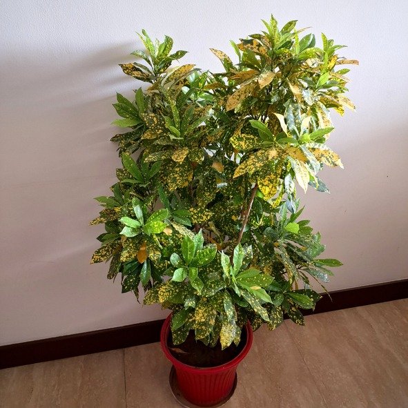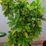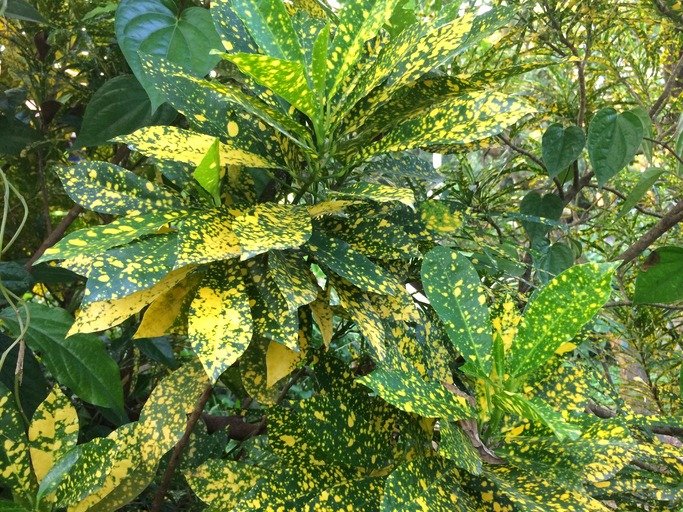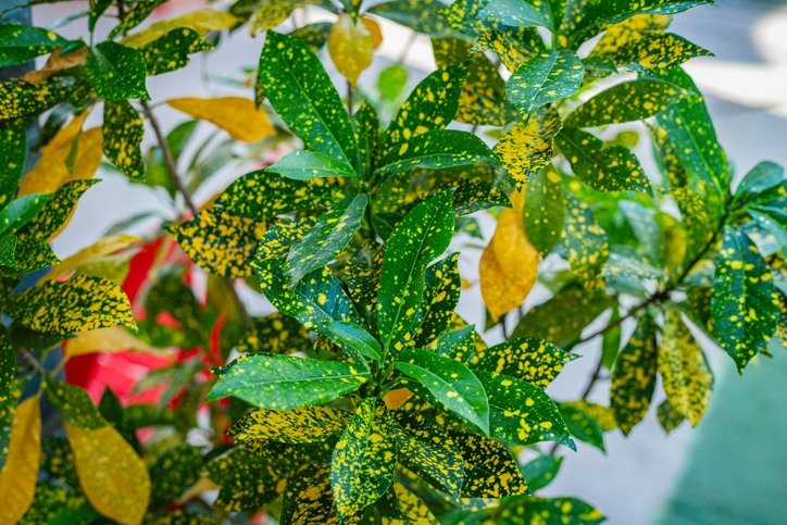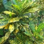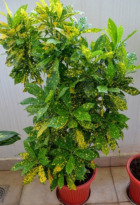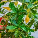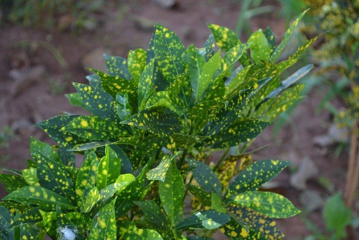 קרוטון מנוקד הוא צמח בית ומרפסת בעל עלים מעניינים עם נקודות זהובות עליהם.