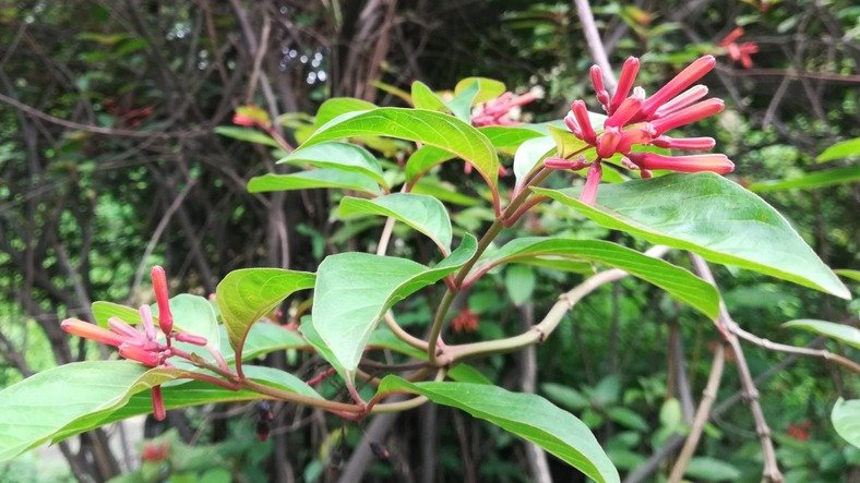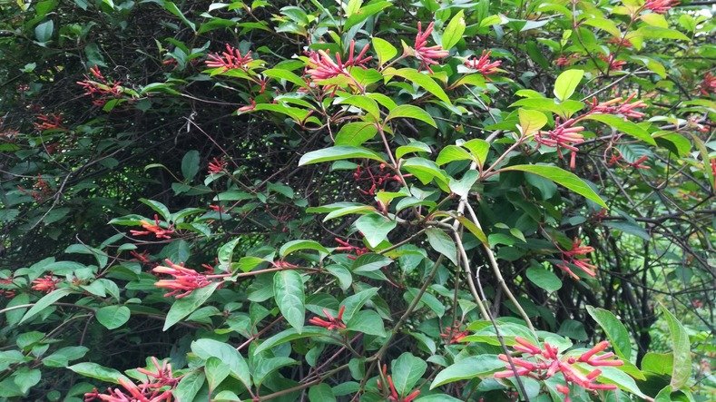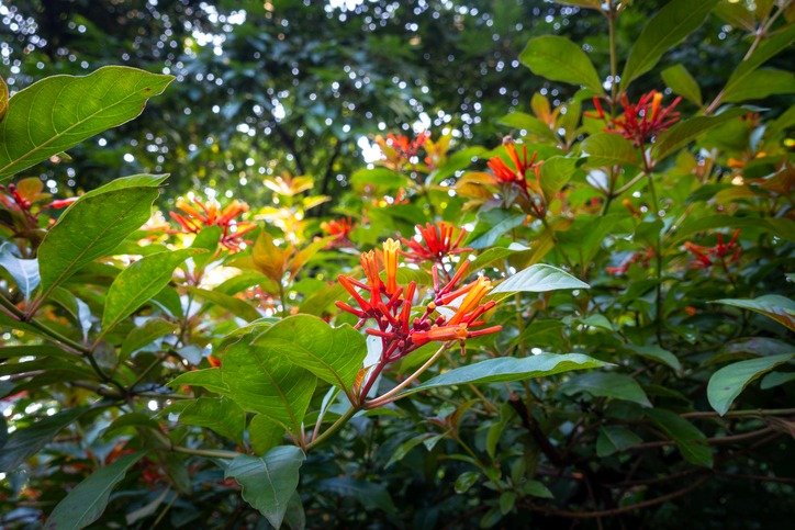 שיח רב שנתי ירוק עד עם פריחה כתומה־אדמדם עשירה.