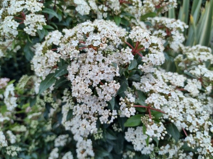 פריחה לבנה ריחנית ופירות אדומים דקורטיביים.